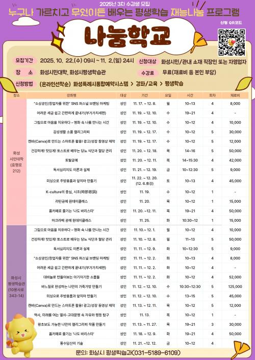 [½Åµ¿¾Æ¹æ¼Û=ÀÌÀçö±âÀÚ] È­¼ºÆ¯·Ê½Ã(½ÃÀå Á¤¸í±Ù)°¡ 22ÀϺÎÅÍ 11¿ù 2ÀϱîÁö 2025³â 3Â÷ ³ª´®Çб³ ¼ö°­»ýÀ» ¼±Âø¼ø ¸ðÁýÇÑ´Ù. ³ª´®Çб³´Â ÀڽŸ¸ÀÇ Áö½Ä, Àç´É, ±â¼úÀ» ŸÀΰú °øÀ¯ÇÏ°í ¹è¿ï ¼ö ÀÖ´Â Àç´É³ª´® ÇÁ·Î±×·¥À¸·Î, À̹ø 3Â÷ ¸ðÁý¿¡´Â Àι®±³¾ç¡¤¹®È­¿¹¼ú ºÐ¡¦