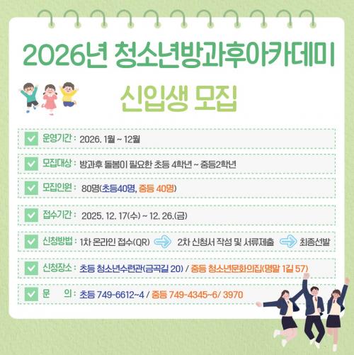 [½Åµ¿¾Æ¹æ¼Û ¼øÃµ=±è¿ëÈÆ ±âÀÚ] ¼øÃµ½Ã´Â 2026³âµµ û¼Ò³â¹æ°úÈľÆÄ«µ¥¹Ì ½ÅÀÔ»ýÀ» ¿À´Â 17ÀϺÎÅÍ 26ÀϱîÁö 10Àϰ£ ¿Â¶óÀÎÀ» ÅëÇØ ¸ðÁýÇÑ´Ù. ¸ðÁý ´ë»óÀº û¼Ò³â¼ö·Ã°ü¿¡¼­ ÃʵîÇб³ 4~6Çгâ 40¸í, û¼Ò³â¹®È­ÀÇÁý¿¡¼­ ÁßÇб³ 1~2Çгâ 40¸íÀ̸ç, Á¤¿øÀ» ÃʰúÇÒ °æ¿ì¡¦
