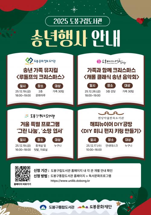 [½Åµ¿¾Æ¹æ¼Û µµºÀ±¸=À̽ŵ¿±âÀÚ] ¼­¿ï µµºÀ±¸ µµºÀ¹®È­Àç´Ü ¼Ò¼Ó ±¸¸³µµ¼­°ü 4°³°üÀÌ 12¿ù ÇÑ ´Þ°£ ´Ùä·Î¿î Çà»ç¸¦ ¿î¿µÇÑ´Ù. ¿ø´ç¸¶À»ÇÑ¿Áµµ¼­°üÀº 12¿ù 17ÀÏ ¡®DIY ¹Ì´Ï ÆíÁö ۸µ ¸¸µé±â¡¯ Çà»ç¸¦, µµºÀ¹®È­Á¤º¸µµ¼­°üÀº 12¿ù 19ÀÏ ¼Û³â °¡Á· ¹ÂÁöÄà ¡®·çµ¹ÇÁÀÇ ¡¦