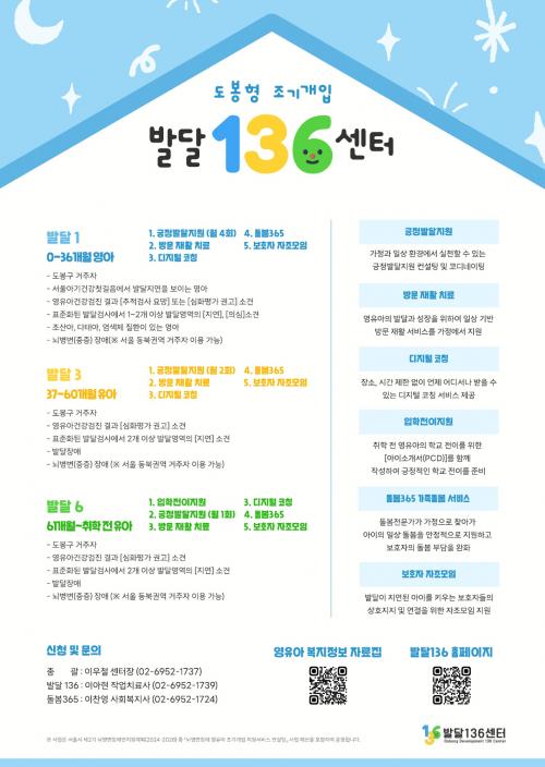 [½Åµ¿¾Æ¹æ¼Û µµºÀ±¸=À̽ŵ¿±âÀÚ] ¼­¿ï µµºÀ±¸°¡ ¹ÌÃëÇÐ ¿µÀ¯¾Æ¸¦ ´ë»óÀ¸·Î »ý¾ÖÁֱ⠸ÂÃãÇü Á¶±â°³ÀÔ ¡®¹ß´Þ 136 »ç¾÷¡¯À» ÃßÁøÇÑ´Ù. ¹ß´Þ 136 »ç¾÷Àº µµºÀ±¸°¡ Áö¿øÇÏ°í µµºÀÀå¾ÖÀÎÁ¾ÇÕº¹Áö°üÀÌ ½ÃÇàÇÏ´Â µµºÀ±¸ ½Å±Ô º¹Áö »ç¾÷ÀÌ´Ù. ¹ß´ÞÀÌ ´À¸®°Å³ª Àå¾Ö À§ÇèÀÌ¡¦