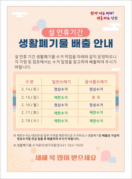 [½Åµ¿¾Æ¸Á¼Û=ÀÌÀçö±âÀÚ] ´çÁø½Ã´Â ¼³ ¿¬ÈÞ¸¦ ±â°£ ½Ã¹Î ºÒÆíÀ» ÃÖ¼ÒÈ­Çϰí ÄèÀûÇÑ µµ½Ã ȯ°æÀ» À¯ÁöÇϱâ À§ÇØ ¿¬ÈÞ ±â°£ Áß »ýȰÆó±â¹° ¼ö°Å ÀÏÁ¤À» Á¶Á¤¡¤¿î¿µÇÑ´Ù°í 11ÀÏ ¹àÇû´Ù. ½Ã¿¡ µû¸£¸é ¼³ ¿¬ÈÞ ±â°£ÀÎ 2¿ù 14ÀϺÎÅÍ 2¿ù 18ÀϱîÁö ÀϹݾ²·¹±â¿Í À½½Ä¹°¾²·¹±â¡¦
