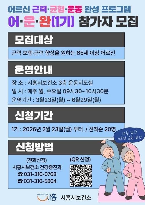 [½Åµ¿¾Æ¹æ¼Û ½ÃÈï½Ã=À̽ŵ¿±âÀÚ] ½ÃÈï½Ã´Â ¾î¸£½ÅµéÀÇ ±Ù·Â Çâ»ó°ú ³«»ó ¿¹¹æÀ» À§ÇØ ¡®¾î¸£½Å ±Ù·Â¤ý±ÕÇü ¿îµ¿ ¿Ï¼º ÇÁ·Î±×·¥(ÀÌÇÏ, ¾î¤ý¿î¤ý¿Ï)¡¯ 1±â Âü°¡ÀÚ¸¦ ¸ðÁýÇÑ´Ù. ¡®¾î¤ý¿î¤ý¿Ï¡¯Àº º¸°Çº¹ÁöºÎ¿Í Çѱ¹°Ç°­ÁõÁø°³¹ß¿øÀÌ °³¹ßÇÑ ¾î¸£½Å ¸ÂÃãÇü ±Ù·Â¤ý±ÕÇü ¿î¡¦