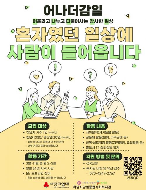 Çϳ²½Ã°¨ÀÏÁ¾ÇÕ»çȸº¹Áö°ü, 1ÀÎ °¡±¸ »çȸÀû °ü°è¸Á Çü¼º ÇÁ·Î±×·¥ ¡¸¾î³ª´õ °¨ÀÏ(¾î¿ï¸®°í ³ª´©°í ´õºÒ¾î»ç´Â °¨»çÇÑÀÏ»ó)¡¹ Âü¿©ÀÚ ¸ðÁý