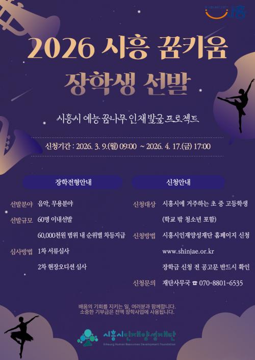 [½Åµ¿¾Æ¹æ¼Û ½ÃÈï½Ã=À̽ŵ¿±âÀÚ] ½ÃÈï½ÃÀÎÀç¾ç¼ºÀç´ÜÀº Áö¿ª ³» ¿¹´É ºÐ¾ß ÀÎÀ縦 ¹ß±¼¤ýÀ°¼ºÇϱâ À§ÇØ ¡®2026³â ½ÃÈï ²ÞŰ¿ò ÀåÇлý¡¯À» 60¸í À̳»·Î ¼±¹ßÇÑ´Ù. ¡®²ÞŰ¿ò ÀåÇлý¡¯ »ç¾÷Àº ¿¹¼úÀû Àç´É°ú ¼ºÀå °¡´É¼ºÀ» Áö´Ñ ÇлýµéÀÌ ²ÞÀ» Ű¿ì°í Àü°ø Ȱµ¿¿¡ Àü³ä¡¦