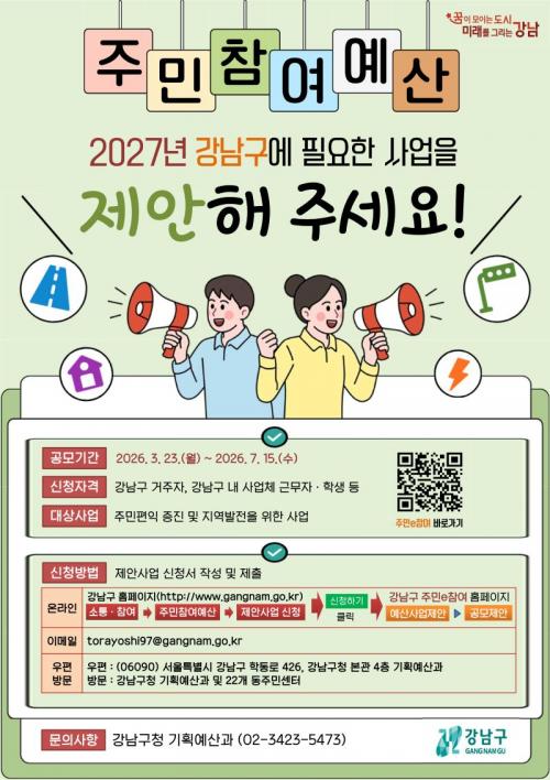 [½Åµ¿¾Æ¹æ¼Û °­³²±¸=À̽ŵ¿±âÀÚ] ²ÞÀÌ ¸ðÀÌ´Â µµ½Ã, ¹Ì·¡¸¦ ±×¸®´Â °­³²±¸°¡ 2027³âµµ ¿¹»êÆí¼º¿¡ ¹Ý¿µÇÒ ÁÖ¹ÎÂü¿©¿¹»ê Á¦¾È»ç¾÷ °ø¸ð¸¦ 3¿ù 23ÀϺÎÅÍ 7¿ù 15ÀϱîÁö ÁøÇàÇÑ´Ù. ¿ÃÇØ °ø¸ð ±Ô¸ð´Â ÃÑ 13¾ï ¿øÀ¸·Î, ÁÖ¹ÎÀÌ Á÷Á¢ »ýȰ ¼Ó ºÒÆíÀ» ÇØ°áÇϰí Áö¿ª¿¡ ÇÊ¿äÇÑ »ç¾÷¡¦
