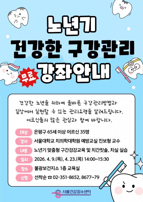 [½Åµ¿¾Æ¹æ¼Û ÀºÆò±¸=À̽ŵ¿±âÀÚ] ¼­¿ï ÀºÆò±¸´Â ¾î¸£½ÅµéÀÇ ±¸°­ °Ç°­ ÁõÁø°ú °Ç°­ÇÑ ³ëÈÄ»ýȰ Áö¿øÀ» À§ÇÑ ¡®³ë³â±â °Ç°­ÇÑ ±¸°­°ü¸®¹ý¡¯ Ưº°°­¿¬À» ÁøÇàÇÑ´Ù°í ¹àÇû´Ù. ³ë³â±â¿¡´Â ÀÕ¸öÁúȯ°ú Ä¡¾Æ »ó½Ç µî ±¸°­ °Ç°­ ¹®Á¦°¡ »îÀÇ Áú ÀúÇÏ·Î À̾îÁú ¼ö ÀÖ¾î ü°èÀû¡¦