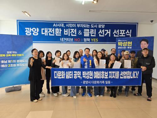 [½Åµ¿¾Æ¹æ¼Û Àü³²±¤¾ç=¹Ú±¤¿Á±âÀÚ] ±¤¾ç½Ã ´Ù¹®È­°¡Á¤ ±¸¼º¿øµéÀÌ ¹Ú¼ºÇö ±¤¾ç½ÃÀå ¿¹ºñÈĺ¸¿¡ ´ëÇÑ ÁöÁö¸¦ ¼±¾ðÇß´Ù. ´Ù¹®È­°¡Á¤ ±¸¼º¿ø 10¿© ¸íÀº 29ÀÏ ¿ÀÈÄ ±¤¾ç½Ã ¼ÒÀç ¹Ú¼ºÇö ¿¹ºñÈĺ¸ ¼±°Å»ç¹«¼Ò¿¡¼­ ÁöÁö ÀÔÀå¹®À» ¹ßÇ¥Çß´Ù. À̵éÀº ÀÔÀå¹®¿¡¼­ ¡°±¤¾ç½ÃÀ塦
