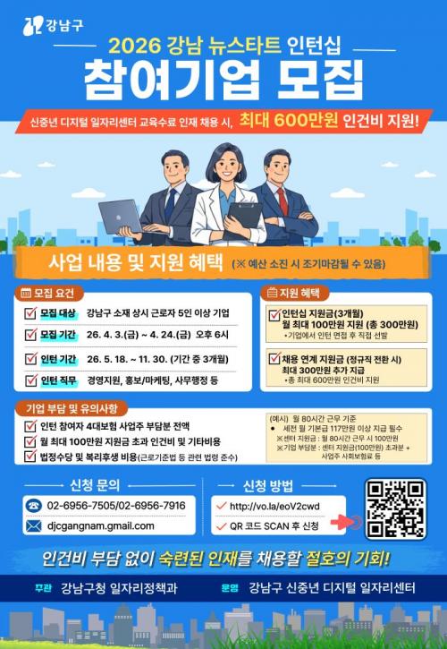 [½Åµ¿¾Æ¹æ¼Û °­³²±¸=À̽ŵ¿±âÀÚ] ²ÞÀÌ ¸ðÀÌ´Â µµ½Ã, ¹Ì·¡¸¦ ±×¸®´Â °­³²±¸°¡ °æ·Â°ú Àü¹®¼ºÀ» °®Ãá ½ÅÁß³âÀÇ ÀçÃë¾÷À» µ½°í ±â¾÷ÀÇ Àη³­À» ´ú±â À§ÇØ ¡®2026³â °­³² ´º½ºÅ¸Æ® ÀÎÅϽʡ¯ Âü¿©±â¾÷À» ¸ðÁýÇÑ´Ù. ±â¾÷ÀÌ 40~64¼¼ ½ÅÁ߳⠰­³²±¸¹ÎÀ» ½Å±Ô ä¿ëÇϸé ÀÎÅÏ ±â°£¡¦