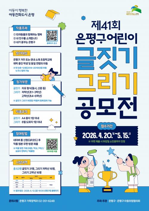 [½Åµ¿¾Æ¹æ¼Û ÀºÆò±¸=À̽ŵ¿±âÀÚ] ¼­¿ï ÀºÆò±¸´Â ¾î¸°ÀÌÁÖ°£ÀÌ Æ÷ÇÔµÈ 5¿ùÀ» ¸Â¾Æ, ÀºÆò±¸ °ÅÁÖ ¾Æµ¿À» ´ë»óÀ¸·Î ¡®Á¦41ȸ ÀºÆò±¸ ¾î¸°ÀÌ ±ÛÁþ±â¡¤±×¸®±â °ø¸ðÀü¡¯À» °³ÃÖÇÑ´Ù°í ¹àÇû´Ù. ¿ÃÇØ·Î 41ȸ¸¦ ¸ÂÀº À̹ø °ø¸ðÀüÀº ÀºÆò±¸¿Í ÀºÆò±¸ ¾Æµ¿À§¿øÇùÀÇȸ°¡ °øµ¿ ÁÖÃÖ¡¦